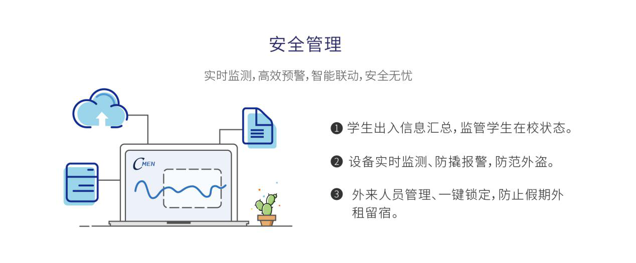 学生信息与智能终端绑定,只有本宿舍的人员能够开门,有效解决了学生私下换寝,假期寝室外租的问题。利用大数据分析技术,对学生日常出入数据进行分析,及时了解学生出行动态,防止突发事件发生。