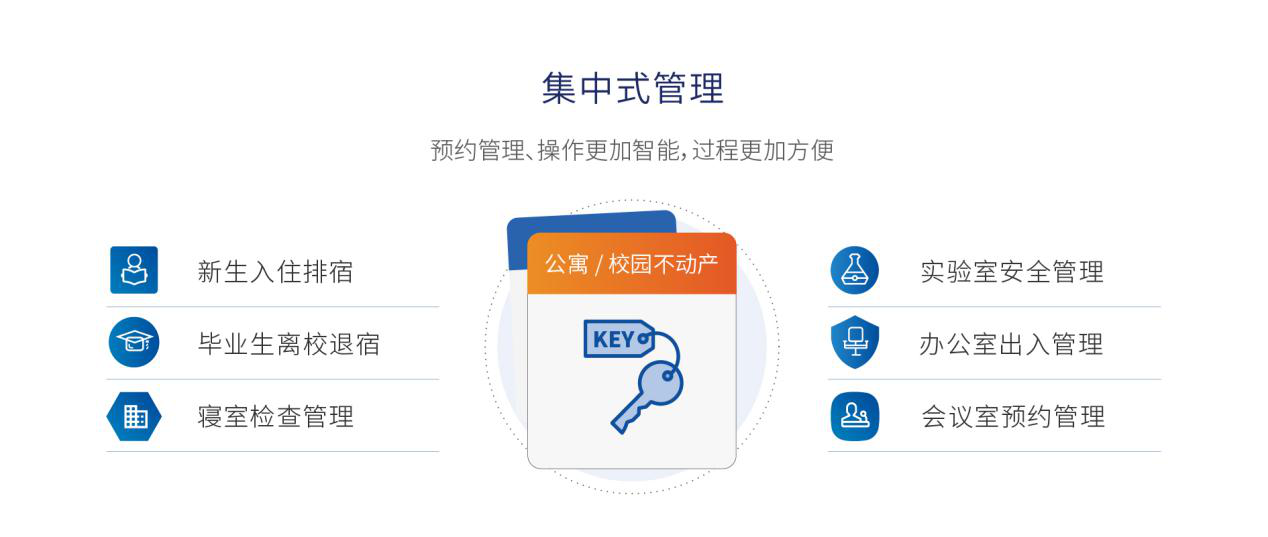通过软件后台与智能硬件的联动,帮助学校解决不动产管理难题,实现办公室安全管理,实验室出入管理,会议室预约管理等。