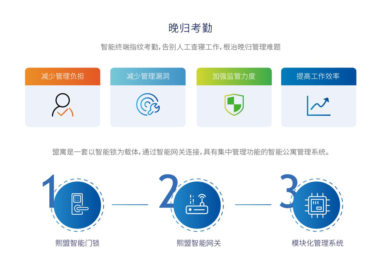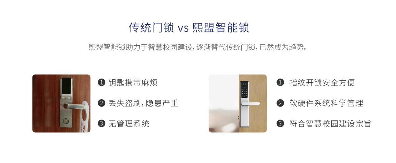 熙盟科技以自主研发的控制算法和通信模组为基础,依托智能门锁与服务软件,针对校园管理痛点,服务校园不动产管理。通过系统锁定学生信息并与宿舍绑定,同时可以做到实时监控、水电费查询、费用催缴、冻结门锁等功能,杜绝安全隐患,助力智慧校园建设。
