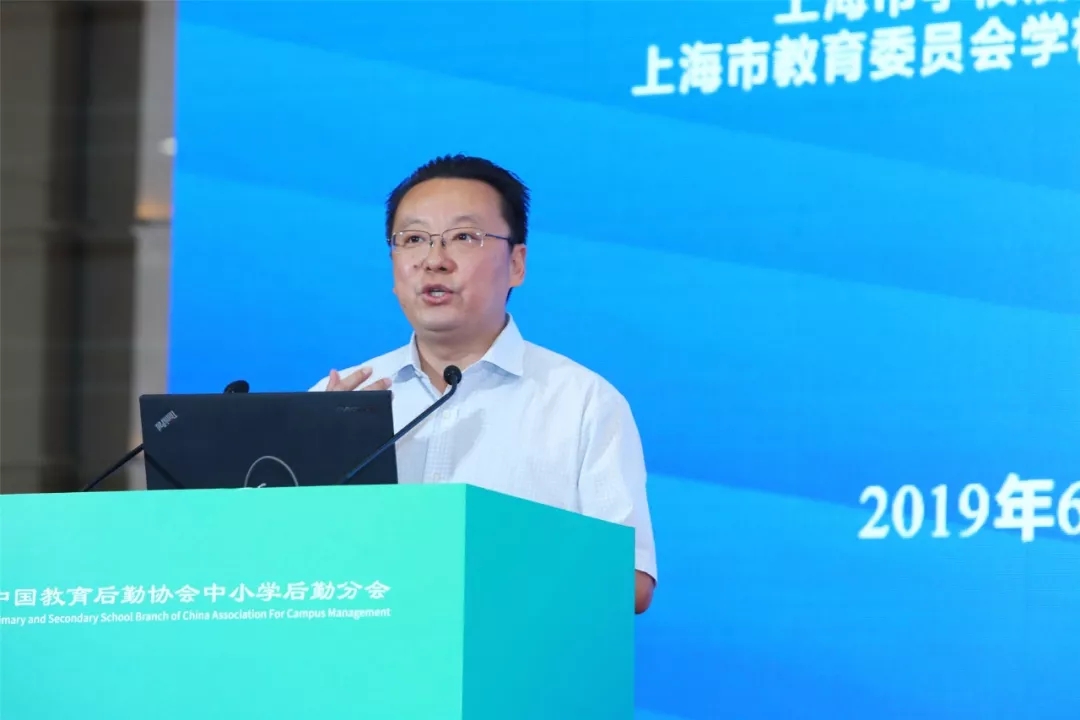 上海市学校后勤协会常务副会长、上海市教委学校后勤保卫处处长张旭作《对标教育现代化2035探索中小学后勤改革新思路》主题发言