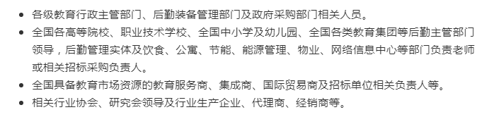 组委会在展会期间组织校企对接活动,根据参观团的基本需求引导组团参观商巡展相对应的展台,与展商进行精准对接;并打造规模空前的教育后勤一站式采购平台,为教育后勤管理提供高效、便捷、精准、前沿的采购渠道。