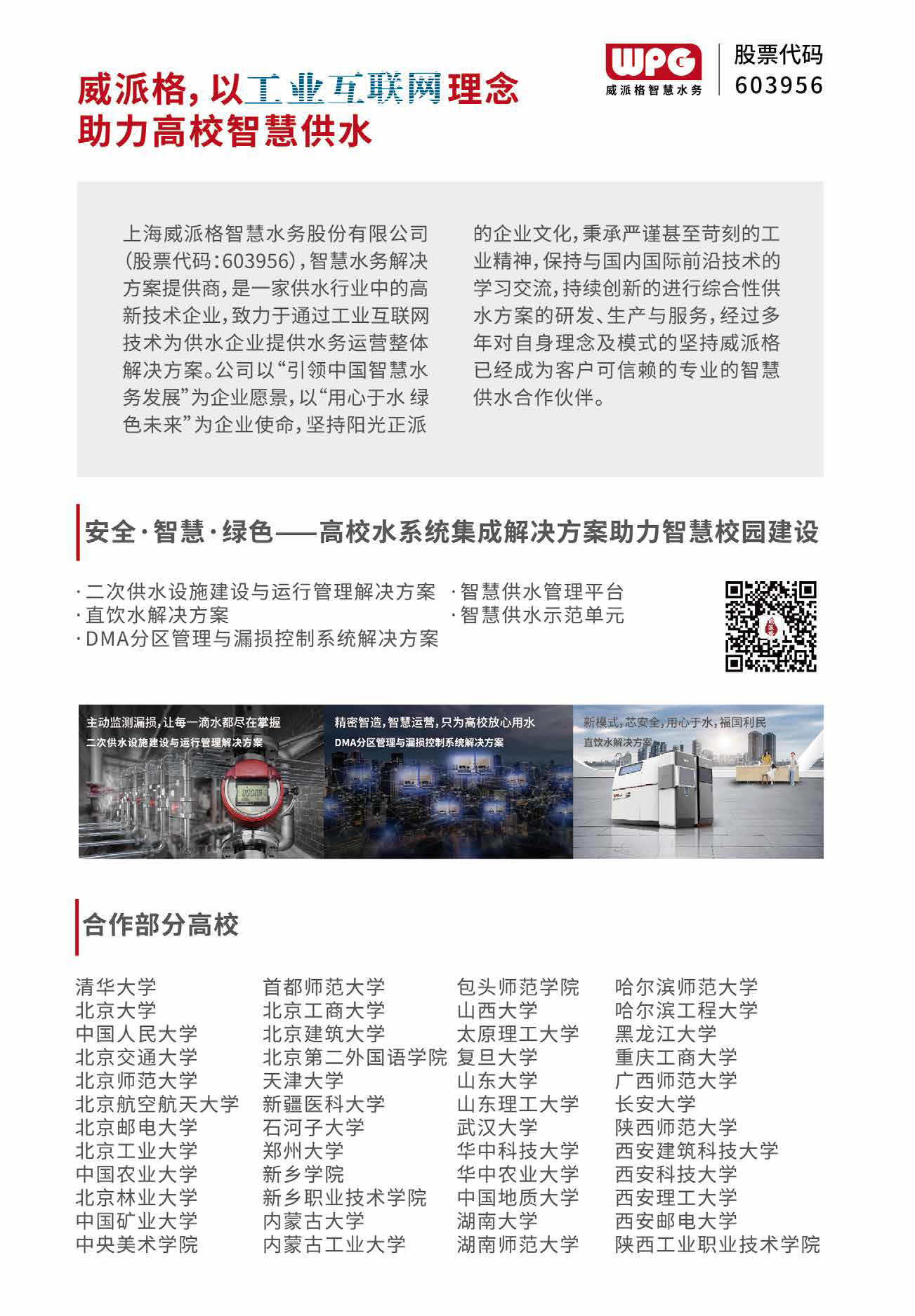 上海威派格智慧水务股份有限公司成立于2011 年,注册在上海市嘉定区恒定路1 号,是国内供水行业集调研咨询、方案设计、智能制造、智慧水务软件开发与运维服务于一体的物联网科技企业。企业于2019年2月22日在上海证券交易所挂牌上市,股票简称威派格,股票代码603956。